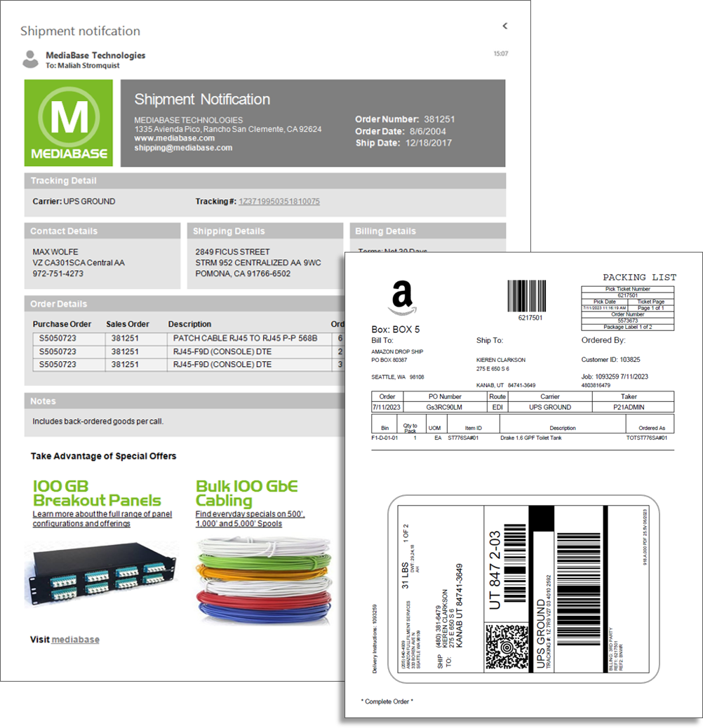 ShipLink View improves customer communications and expands marketing reach with every shipment. Driven by order, customer and item data, the solution applies business rules and document templates to generate custom emails, printed documents and reports, including:
